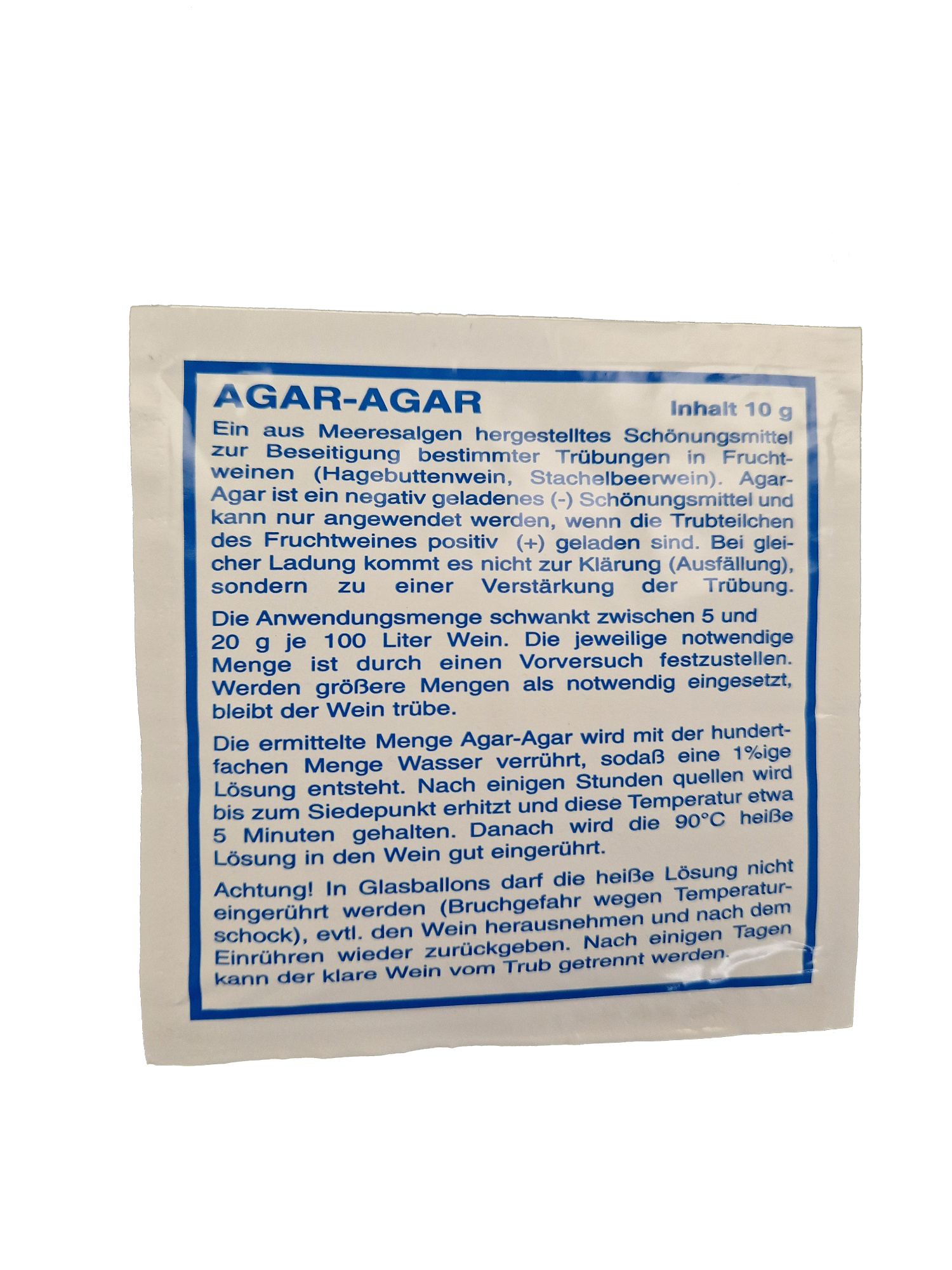 Agar-Agar ist ein pflanzliches pulverförmiges Schönungsmittel zur Beseitigung von Trübungen in Fruchtwein.